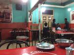 Vorbei an einer offenen Kochstelle, betreten wir einen kleinen Raum mit türkis angestrichenen Wänden, ein paar Tischen und ausschließlich männlichem Publikum, die gebannt ihre Blicke auf uns richten, als wir Platz nehmen.