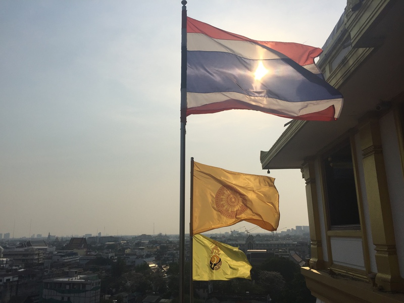 Einen liegenden Buddha, tanzende Kinder in aufwendig verzierten Kostümen und gefühlte 5L Wasser später, befinden wir uns auf einem Hügel mit Blick über ganz Bangkok. "Golden Mound" spricht für sich und lässt uns beim Anblick sofort alle vorangegangenen Wasserangriffe vergessen. Diese nehmen uns jedoch recht schnell wieder ein, als unser Taxifahrer uns eine Stunde später wieder zurück ins die Wildnis aussetzt. Die Straßen immer voller und mit ihnen die Menschen, welche schreiend und lachend mit schallender Musik aus allen Ecken feiern und tanzen.