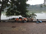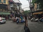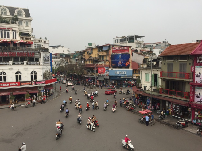 Wir verabschieden uns also vom wunderschönen Bangkok und sagen Xin chao Hanoi. So begrüßt uns Vietnams Hauptstadt mit bewölktem Himmel, einem subtropischen Klima und einem Taxifahrer, der seine Entscheidungsschwierigkeiten auf der Straße versucht zu bewältigen. Anstelle von links oder rechts fährt dieser konstant auf dem Mittelstreifen. Generell scheinen die Verkehrsregeln auch hier keinen besonders hohen Stellenwert zu haben. Wo unsererseits schon allein das Fahrradfahren ohne Helm verpönt ist, wird hier das Joggen auf der Autobahn wohl als absolut selbstverständlich angesehen. Seelenruhig wird hier nämlich auf dem Seitenstreifen für den nächsten Marathon geübt. Im Vergleich zu der Straßenlage, die sich immer mehr verengt je näher wir Hanoi's Zentrum kommen, ist das Laufen auf dicht befahrenem Highway jedoch wohl weniger gefährlich als das Überqueren einer Straße. Auf einer zwei spurigen Fahrbahn drängen sich hier neben vereinzelten Pkw's gefühlte hundert Rollerfahrer, die neben vollbeladenen Kartons und Kisten auch die ein oder andere Großfamilie transportieren. Mit wildem Gehupe wird nun von rechts und links überholt, geschnitten und generell gefahren, wie es die Lücke eben gerade zulässt. Wer nicht wagt, der nicht gewinnt.