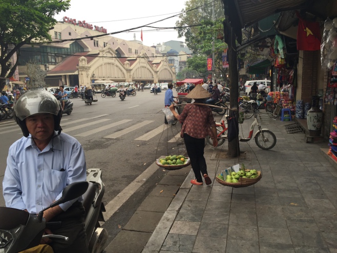 Und so laufen wir siegessicher und abgehärtet, so glauben wir, mit einem Stadtplan bewaffnet durch die Altstadt Hanoi's, bestehend aus schmalen Gässchen, kleinen niedlichen Restaurants und Bars, vorbei an in kolonial Stil erbauten Häusern, deren Balkone geschmückt sind mit bunten Lampions, einigen Tempeln zwischendrin und einem Pulk an Menschen, ein Treiben, das an ein Ameisennest erinnert. Stets fleißig in Bewegung. Frauen mit Strohhüten balancieren gekonnt eine Stange mit jeweils zwei Körben rechts und links gefüllt mit Gemüse auf einer Schulter. Am Straßenrand oder auch gerne mittendrin werden Obststände mit exotischen Früchten angeboten, beträufelt mit Zucker und Chilli und davon nicht zu wenig. Mit hochrotem Gesicht und tränenden Augen schlendern wir, eine dieser Chilli Mango Spezialitäten essend, bei feucht heissen 34 Grad nun am Hoam Khiem Lake vorbei, während die leicht pikante Chillinote uns sämtliche Geschmacksnerven abzutöten scheint. Inmitten von vorwiegend asiatischen Touristen besichtigen wir einige der bekannten Tempel Hanoi's. Beeindruckende Architektur umhüllt von einem betörenden Duft vieler vor sich hinziehender Räucherstäbchen.