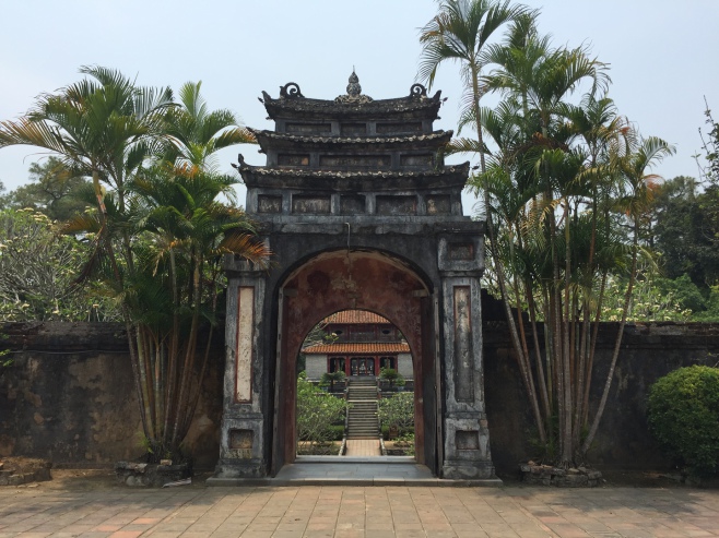 So bietet die Kaiserstadt Hué uns einen kleinen Einblick in das Zeitgeschehen einige Jahre vor unserer Zeit. Mit einem weiteren Weltkulturerbe, der Zitadelle mit ihrer verbotenen Stadt, verbringen wir fast ganze zwei Stunden in einem Areal, das umringt ist von einer zehn Kilometer langen Mauer und begutachten die Überreste eines längst verlassenen Lebens. Wo wir einst irgendwann unsere sterblichen Überreste auf einem Friedhof inmitten vieler anderer Grabstätten zurücklassen werden, so bekommt hier jeder Kaiser nicht nur ein eigenes Grab, sondern viel mehr ein Grundstück, das dem einer kleinen Reihenhaussiedlung nahe kommt. So betreten wir durch ein schweres Steintor den Vorderhof einer Grabstätte des Kaisers Minh Mang, dessen versteinerte Wächter, die links und rechts von uns in Stein gemeißelt aufgereiht sind das Grab bewachen. Die gesamte Fläche bestehend aus mehreren kleinen Tempeln und dem eigentlichen Mausoleum des verstorbenen Kaisers werden umringt von einem mit Seerosen bedeckten kleinen Teiches. Ein Ort der Ruhe und des Friedens.