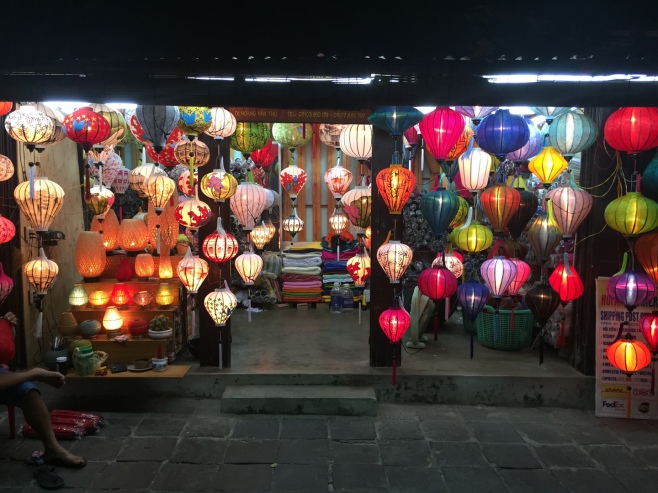 Trotz der Ansammlung an Touristen, die überwiegend asiatischer und vereinzelt auch europäischer Herkunft sind, strahlt die Stadt eine romantische Idylle aus und ist somit der perfekte Treffpunkt für die frisch Verliebten. Da zumindest eine von uns das von sich behaupten kann, schenke ich meine vollste Verliebtheit dieser Stadt. Da wir uns für gewöhnlich nicht nur in die inneren Werte verlieben sondern vorerst auch das Äußere einen bleibenden Eindruck hinterlässt, sind wir vom Anblick der kleinen Gassen, die beleuchtet sind mit bunten Lampions, seinen alten Fassaden, an denen prachtvolle Blüten verschiedenster Arten hinauf ranken und den lächelnden Gesichtern der Händler an kleinen Verkaufsständen, berührt und hingerissen. Wie in einem Traum betreten wir eine Stadt, die wohl schöner nicht sein kann. Und nicht umsonst steht sie unter den Top 10 der attraktivsten Städte Asiens. Bunt und freundlich erstreckt sich uns ein farbenfroher Anblick aus warmen Lichtquellen, die von Lampions, Laternen und Kerzen herrühren, und sich in einem kleinen schmalen Fluss am Ufer widerspiegeln. Man könnte sagen, wir sind zur richtigen Zeit am richtigen Ort. Genau passend zum Vollmond findet hier ein Lichtfest statt, bei dem größtenteils alle elektrischen Lichter ausgeschaltet werden und anstelle dessen Laternen, Kerzen und Lampions die Straßen Hoi An's beleuchten und in warmes Licht hüllen. Wie wir später herausfinden scheint hier jeder Tag die richtige Zeit zu sein, denn treffen wir die niedlichen alten Damen hier täglich wieder, die uns mit breitem zahnlosen Lächeln freundlich bitten, eine ihrer schwimmenden Kerzenschiffchen zu erwerben, um diese anschließend aufs Wasser gleiten zu lassen. Und so begrüßt uns Abend für Abend eine gemütliche Atmosphäre, die uns einlädt in einem der zahlreichen kleinen Restaurants am Ufer Platz zu nehmen und mit Blick auf den mit Lichtern gefüllten Fluss, die vietnamesische Küche zu genießen. Und nicht nur die liebevoll gestalteten Lokale laden uns herzlich ein, auch die Boutiquen am Straßenrand, kleine Stände und der Nachtmarkt, verführen uns zu einer Endlosschleife des Kaufwahns. Von bunten kitschigen Souvenirs, über handbestickte Taschen, bis hin zu luftigen Sommerkleidchen schlendern wir von Shop zu Shop und bereichern die Händler um einige vietnamesische Dong. So ist Hoi An nicht nur bekannt für seine bunte Vielfalt an Lichtern, sondern ebenso für seine Schneiderkünste und zieht somit die Modewelt derer in ihren Bann, die sich gerne Kleidung nach Maß anfertigen lassen möchten. Das Letzte was wir jedoch nun verspüren, ist der Wunsch bei 34 Grad trockener Hitze in einer Maßanfertigung von Kleid zu stecken. Da es bis zum Brautkleid voraussichtlich sowieso noch einige Zeit benötigt, sehen wir dies als eher nicht notwendig und ziehen dem Wetter entsprechend den Strand Hoi An's, spärlich klimatisierten aufgewärmten Schneidereien vor.