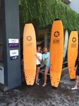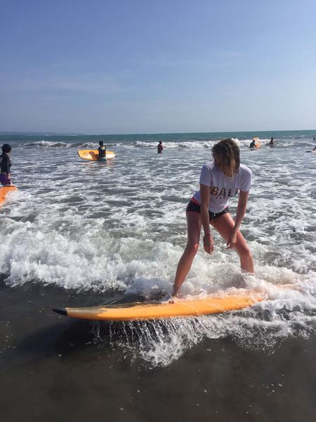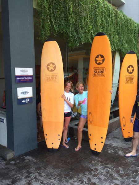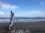 Besuche in Canggu, Ulluwato und Kuta. Dem Ballermann und Patong Beach Bali's, doch ebenso der perfekte Ort für die Surferinnen unter uns. So verschlägt es uns das erste Mal auf ein Surfbrett. An Land und mit entsprechenden Trockenübungen, die die Kunst des Surfen beinhalten, zeigen sich unsere Fähigkeiten vorerst besser, als in der späteren Praxis. Denn da werden wir zu Beginn von unserem Surflehrer im wahrsten Sinne des Wortes ins kalte Wasser geworfen. Und die erste Welle kommt schon schneller als gedacht. Mit verblüfftem Gesichtsausdruck werden wir von einer salzigen Welle nach vorne geschleudert, und ehe wir uns versehen, stranden wir wie eine orientierungslose Seerobbe am Ufer inmitten anderer verloren gegangener blutiger Anfänger. Doch wie sagt man so schön? - Übung macht den Meister. Und auch wenn wir nicht als Meister aus dieser Surfstunde hinausgehen, so schaffen wir es zumindest gerade auf dem Brett zu stehen. Aber ein Meister ist ja nunmal auch noch nie vom Himmel gefallen. Höchstens vom Brett... Und so verfallen wir in eine Endlosschleife anpaddelnder Wellen, ausbalancierenden Ausfallschritten, wedelnden Armen, der ein oder anderen Sprung,- Fall,- oder Klatschpartie ins Wasser, bis wir letztendlich einigermaßen sicher unseren Körper auf dem schwimmenden Brett unter Kontrolle bringen. Vergessen wir all die Stereotypen von Surfern, die völlig schwerelos mit einem Monster von Brett unter einem einzigen Arm zum Wasser laufen. Leichtfüßig und sanft wie ein springendes Reh. Strandschönheiten mit wallender Mähne, die wie in Zeitlupe über den Sand gleiten, mit ihrem Board untertauchen, Welle für Welle gekonnt reiten und anschließend braungebrannt und durchtrainiert bei Sonnenuntergang den Strand und die Weiten des Meeres verlassen.