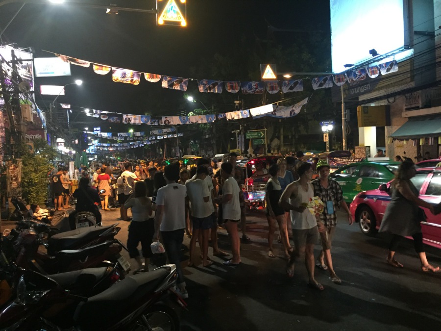 Gerade als wir uns wieder an die nasse Kleidung und der dazugehörigen Abschussrate einer mit Pfützenwasser gefüllten Kinderwasserpistole von ungefähr alle paar Sekunden gewöhnt haben, werden wir nun auch noch von fremden Händen inmitten der Fußgängerzone, die sich nun auch bis auf die Straße erstreckt, mit weisser Farbe vollgeschmiert. Wie die Indianer auf Kriegsfuß kämpfen wir uns durch die Menge vor zu unserem Hostel, das uns trotz fehlenden Fensters und penetrant gestrichenen grünen Wänden, die meinem schweißtreibenden Overall ähneln, in diesem Moment sehr einladend erscheint. Nachdem wir die Blessuren des Thai New Years Day, das wie wir feststellen sehr ausgiebig und feucht fröhlich gefeiert wird, von uns gewaschen und einer äußerst schmerzhaften, jedoch sehr wirksamen traditionellen Thaimassage unterzogen haben, runden wir unseren Abend ab mit einem wunderbaren thailändischen Essen und einem Liter Chang Bier, das nicht nur unseren verlorenen Flüssigkeitshaushalt die Fülle verleiht.