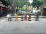 einem klapprigen Gestell auf drei Rädern, dessen kleine Personenkabine auf dem Rücksitz noch einmal freundlich mit Hilfe von Aufklebern darauf hinweist, doch bitte ausnahmsweise bei diesem