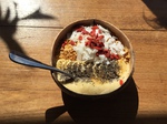 Den nächsten Morgen verbringen wir in einem, aus Bambusstöcken zusammengebauten, niedlichen Café, dessen Traum einer Australierin sich hier inmitten von fröhlichen Gesichtern, frischen Früchten in Kokosnussschalen und frisch gepressten Säften, Realität angenommen hat. Was gibt es schöneres, als den Tag zu beginnen mit frischem Obst und einer Mischung Aloe Vera mit Ingwer inmitten warmherziger Atmosphäre, einer leichten Prise, strahlend blauem Himmel und einem einzigen Termin: Das Meer.