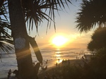 Die Wellen, die wir mehr oder weniger reiten - Rodeo reiten wäre hier die angebrachte Bezeichnung - lenken uns derweil ab von der Sonneneinstrahlung, die uns hier Tag für Tag von oben beglückt. Und so kommen wir nach über zwei Stunden minimal gebräunt und maximal im Gesicht verbrannt von unserer Surfstunde zurück. Nicht nur bleibende Eindrücke bleiben von diesem Tag zurück. Sondern ebenso große blaue Flecken, die dabei entstehen, wenn das Brett eines Chinesen waagerecht auf dich zugeschossen kommt, deinen Oberschenkel brandmarkt, du dich kurz unter Wasser herum schleudern lässt, während besagter Chinese derweil mit seinem Hinterteil dein Gesicht streift.
