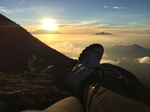 Auch dieser ist nun wieder hellwach, und da wir am Horizont schon leicht die Morgenröte erkennen können, packen wir unsere Sachen zusammen, und machen uns auf zu der Stelle, an dem wir die Sonne herzlich empfangen. Guten Morgen Bali. Guten Morgen Welt. Ein Anblick wie im Bilderbuch und wohl der schönste Sonnenaufgang, den man haben kann. Mit einem Tee und kleinem Frühstück beginnen wir diesen wunderschönen außergewöhnlichen Morgen, lassen uns die Wärme auf unsere gefrorenen Gesichter scheinen, blinzeln der Sonne entgegen und sehen die Wolken vor uns vorbei ziehen. Das Profil, das unser zurück gelegter Weg in der Nacht nur schemenhaft umrandete, wird nun klar und deutlich sichtbar. Und mit der Erkenntnis, diesen steinernen hohen Weg erklommen zu haben, wird mir gleichzeitig bewusst, dass wir diesen nun auch wohl oder übel zurück gehen werden. Wie überall im Leben ist der Aufstieg immer angenehmer, als der Abstieg. Und so klettern wir den vier Stündigen Weg konstant abwärts hinunter, bis ich das Gefühl habe, meine Beine nicht mehr zu spüren und eine Haltung einnehme, die der eines ferngesteuerten Stockes ähnelt. Letztendlich kommen wir aber beide unversehrt am Fuße an und nicht nur ich, sondern auch mein Mitsportler sind froh nun unten angekommen zu sein. Der Muskelkater die nächsten drei Tage ist alles Wert, auch wenn ich mich kaum bewegen kann und mich fühle wie eine achtzig jährige Frau in Kombination mit einem angeschossenen Reh.